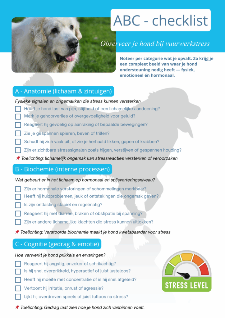 Wat valt je op in zijn lichaam? Hoe is zijn slaap, spijsvertering, energie? Welke situaties lijken spanning op te roepen? 📋Gebruik de ABC – checklist om lichamelijk en emotionele signalen van stress bij je hond te herkennen. Zo krijg je een compleet beeld van wat hij nodig heeft tijdens vuurwerkmomenten.